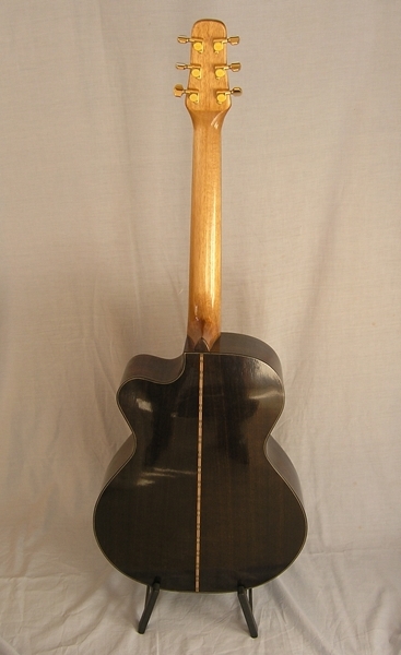 OM cutaway model - Back/Sides: East Indian Rosewood - Top Wood: Sitka Spruce - Neck: Queensland Maple - Neck construction: Bold-on, adjustable rod, 2 graphite bars for very stiff neck to enhance sustain - Headplate: Ebony - Inlay: Paua Builder Logo - Fingerboard: Ebony Fret Markers: paua dots Frets to body: 14 - Bridge: Ebony and Intil Bridgepins - Pickguard: Clear - Finish: gloss waterbased and amber tainted soundboard - Body Bindings: Ebony Back Strip: Inlaid (Checkered D-28) - Rosette: Steelstr LMI R5 - Tuners: Gold Gotoh SG360-01G, ratio 1:14 - Pickup: K&K Mini Western - Body Length: 19 5/8 in. (498.5 mm) Upper Bout: 11 3/8 in. (288.9 mm) - Lower Bout: 15 1/2 in. (393.7 mm) - Body Depth @Neck Heel: 4 in. (101.6 mm) Body Depth @Tail Block: 4 1/4 in. (107.95 mm) - Scale Length: 25.4 in. (645.16 mm) - Nut Width: 1 3/4 in. (44.5mm), bone nut and saddle - Strings Spacing: 59 mm wide - Scalloped X bracing - Rich and balanced tone over full spectrum, great sustain and clear well seperated highs. Very stiff neck and slightly tighter angle of X braces to enhance higher end of spectrum. Great fingerpicking style guitar.
